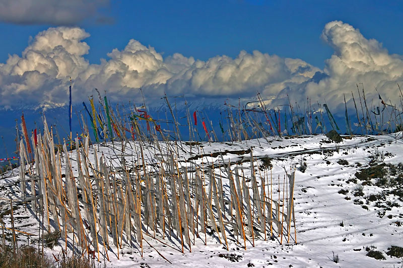 Third Day: After breakfast drive to Punakha with a short stop at Dochula pass (3,080m) stopping briefly here to take in the view and admire the chorten, mani wall, and prayer flags which decorate the highest point on the road. If skies are clear, the following peaks can be seen from this pass (left to right): Masagang (7,158m), Tsendagang (6,960m), Terigang (7,060m ), Jejegangphugang (7,158 m ), Kangphugang (7,170 m), Zongphugang (7, 060 m ), a table mountain that dominates the isolated region of Lunana – finally Gangkar puensum, the highest peak in Bhutan at 7,497m.